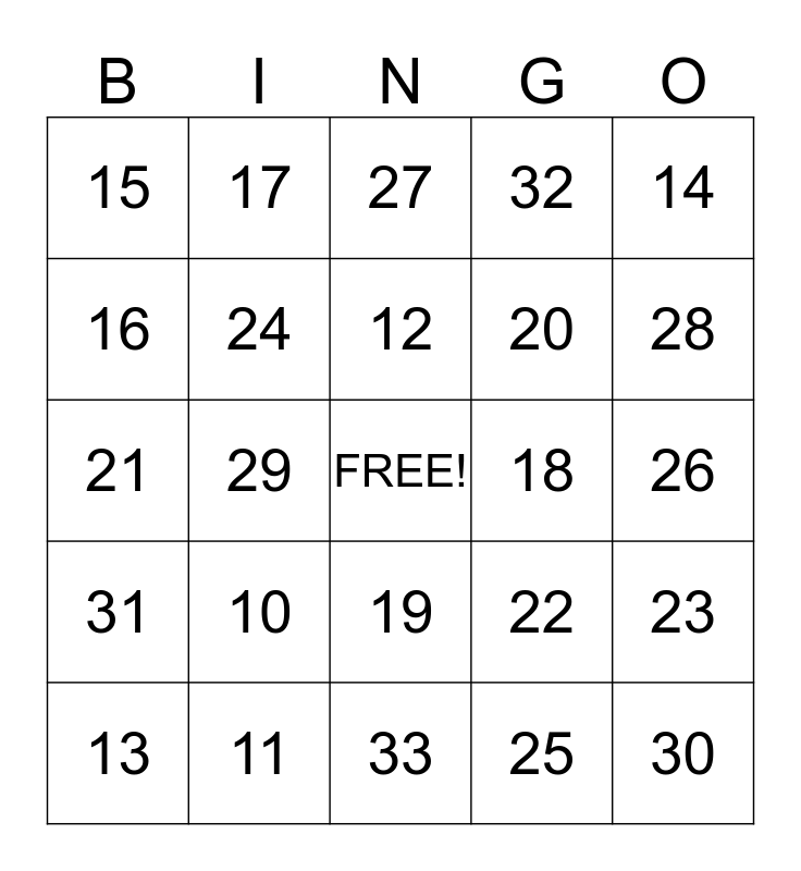 This bingo card has a free space and 24 words: 10, 11, 12, 13, 14, 15, 16, 17, 18, 19, 20, 21, 22, 23, 24, 25, 26, 27, 28, 29, 30, 31, 32 and 33.