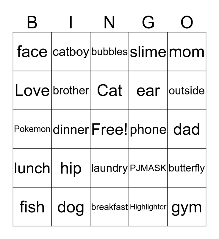 This bingo card has a free space and 24 words: hip, dog, Cat, fish, mom, face, Love, catboy, phone, laundry, ear, Pokemon, PJMASK, butterfly, brother, Highlighter, dad, bubbles, outside, dinner, gym, lunch, slime and breakfast.