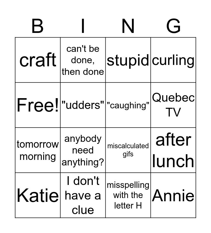 This bingo card has 16 words: I don't have a clue, after lunch, stupid, craft, tomorrow morning, can't be done, then done, miscalculated gifs, misspelling with the letter H, Free!, "udders", Katie, curling, anybody need anything?, Quebec TV, "caughing" and Annie.