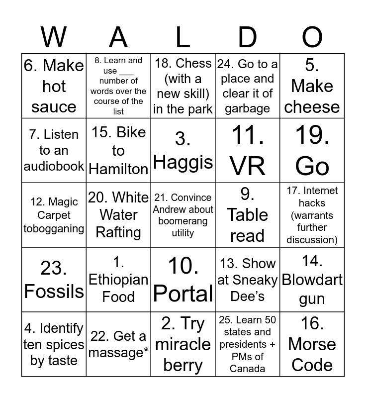This bingo card has 25 words: 1. Ethiopian Food, 2. Try miracle berry, 3. Haggis, 4. Identify ten spices by taste, 5. Make cheese, 6. Make hot sauce, 7. Listen to an audiobook, 8. Learn and use ___ number of words over the course of the list, 9. Table read, 10. Portal, 11. VR, 12. Magic Carpet tobogganing, 13. Show at Sneaky Dee’s, 14. Blowdart gun, 15. Bike to Hamilton, 16. Morse Code, 17. Internet hacks (warrants further discussion), 18. Chess (with a new skill) in the park, 19. Go, 20. White Water Rafting, 21. Convince Andrew about boomerang utility, 22. Get a massage*, 23. Fossils, 24. Go to a place and clear it of garbage and 25. Learn 50 states and presidents + PMs of Canada.