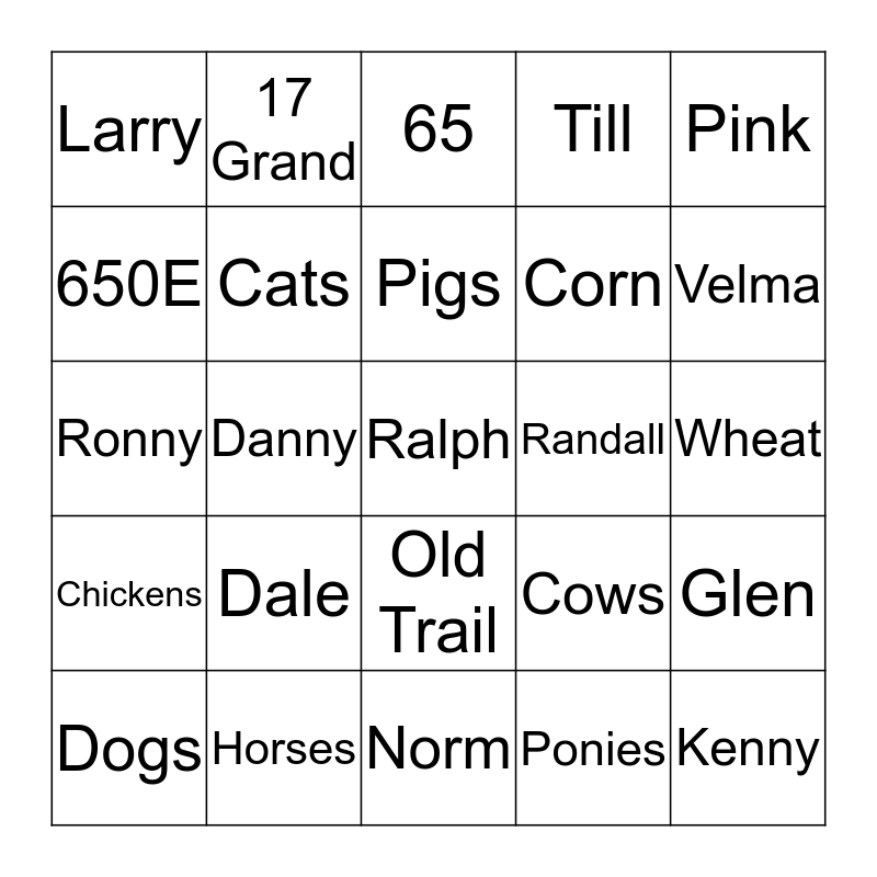 This bingo card has 39 words: Beans, 5 Boys, Oats, Cats, Dogs, Old Trail, Pigs, Twins, Pink, Chickens, Danny, Till, Ralph, Wheat, Randall, Dale, 48 Great, Larry, Mike, Cows, 650E, Norm, Corn, Velma, Marilyn, Dolores, Kenny, Keith, Jesse, 17 Grand, 205, Jay, 65, Horses, Ponies, Oats, Glen, Ronny and Gail.