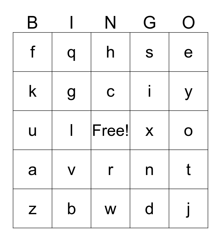 Lower-case Alphabet Bingo Card