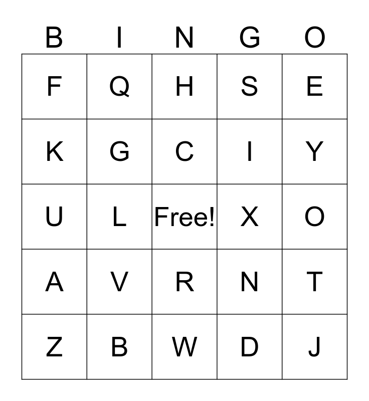 This bingo card has a free space and 26 words: A, B, C, D, E, F, G, H, I, J, K, L, M, N, O, P, Q, R, S, T, U, V, W, X, Y and Z.