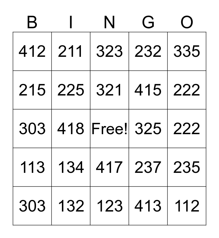 This bingo card has a free space and 49 words: 111, 112, 114, 123, 134, 135, 211, 213, 215, 224, 225, 232, 235, 237, 302, 313, 321, 325, 333, 335, 418, 413, 412, 415, 131, 222, 303, 334, 417, 113, 121, 122, 124, 131, 132, 133, 212, 214, 222, 231, 233, 234, 236, 301, 303, 323, 324, 417 and 331.