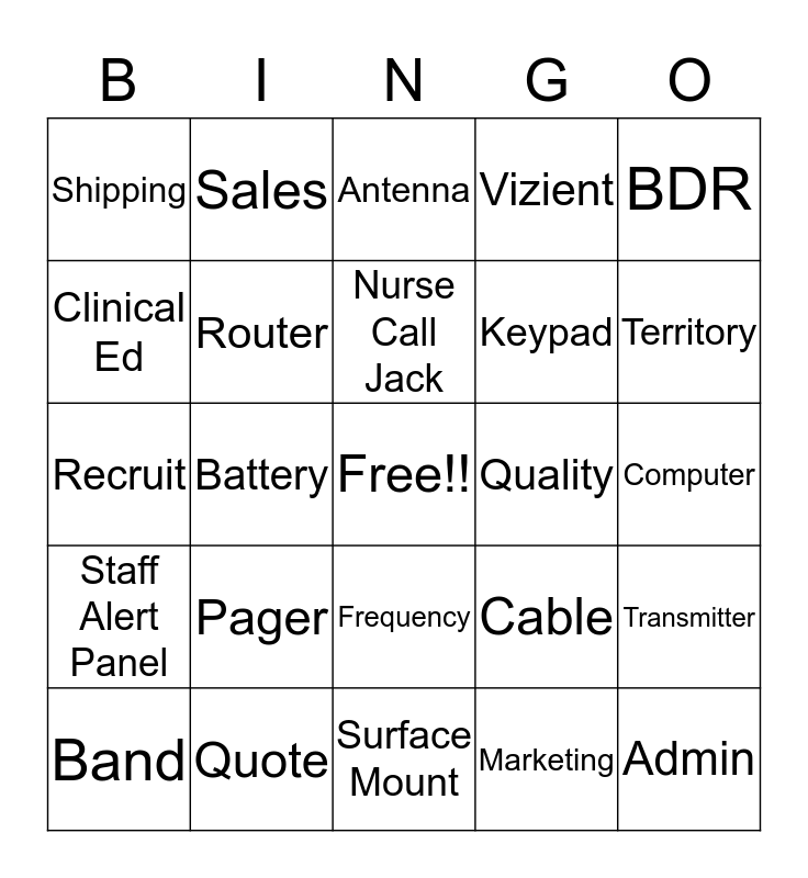 This bingo card has a free space and 54 words: Raceway, Staff Alert Panel, Quick Look Display, Hospital, Frequency, Safe Place, Vizient, Help Alert, Clinical Ed, Code Alert, Shipping, Senior Living, Quote, Band, Lanyard, Surface Mount, Admin, Keypad, Tech Support, Computer, Cable, Quick Touch, Quality, BDR, Service Agreement, Sales, Service, Tester, Premier, Marketing, Sensatec, Revenue, Lock, Pendant, Antenna, Reed Switch, Recruit, Transmitter, Controller, Router, Facilities, Pull Cord, Accounting, Engineer, Pager, Customer Care, Install, IT, Nurse Call Jack, Battery, Territory, Pads, Operations and Project Manager.