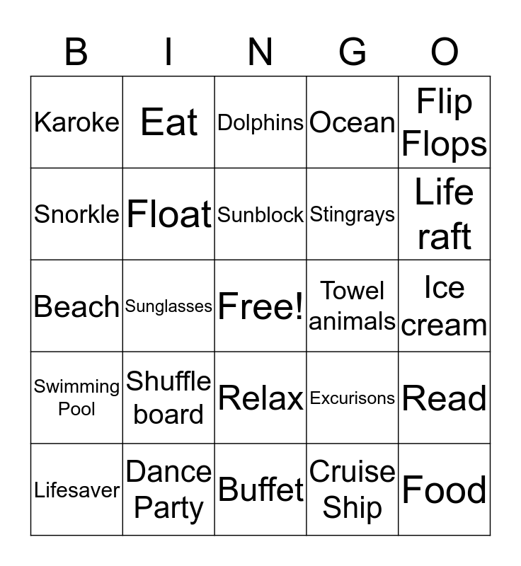 This bingo card has a free space and 32 words: Cruise Ship, Sunshine, Sunglasses, Water Slide, Swimming Pool, Float, Flip Flops, Read, Eat, Summer, Sunblock, Dolphins, Scuba Dive, Beach towel, Towel animals, Lounge chair, Lifesaver, Beach, Relax, Shuffle board, Excurisons, Biking, Ice cream, Dance Party, Food, Ocean, Stingrays, Snorkle, Karoke, Buffet, Games and Life raft.