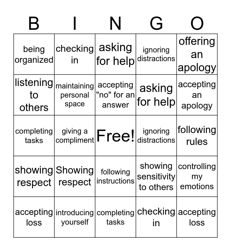 This bingo card has a free space and 24 words: Showing respect, introducing yourself, accepting "no" for an answer, accepting loss, offering an apology, being organized, listening to others, checking in, ignoring distractions, following instructions, asking for help, completing tasks, showing sensitivity to others, controlling my emotions, maintaining personal space, checking in, following rules, asking for help, accepting an apology, giving a compliment, accepting loss, showing respect, ignoring distractions and completing tasks.