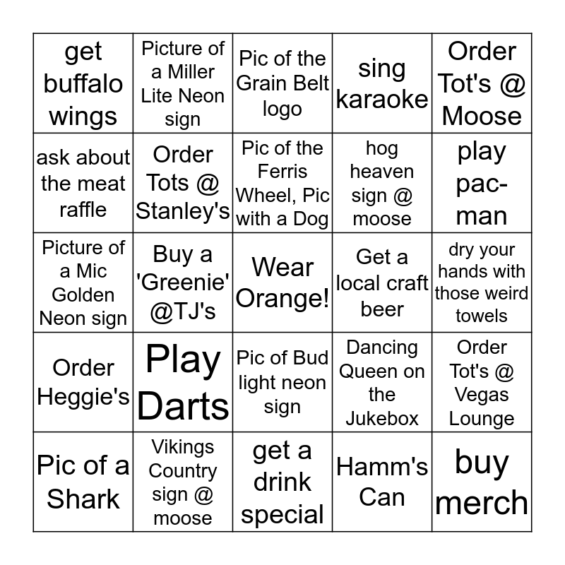 This bingo card has a free space and 32 words: Hamm's Can, PBR Can, Buy a 'Greenie' @TJ's, Order Tots @ TJs, Order Heggie's, Order Tots @ Stanley's, Order Tot's @ Moose, Order Tot's @ Vegas Lounge, Picture of a Miller Lite Neon sign, Picture with TJ's logo outside, Pic of the Ferris Wheel, Pic with a Dog, Pic of the Grain Belt logo, Buy furniture at Al's, Get a Stanley's Shandy, Get a local craft beer, Minnesota-style drink special, Pic of a Shark, Picture of a Mic Golden Neon sign, Pic of Bud light neon sign, Play Darts, Dancing Queen on the Jukebox, winning pull tab, dry your hands with those weird towels, Vikings Country sign @ moose, buy merch, sing karaoke, hog heaven sign @ moose, ask about the meat raffle, get buffalo wings, get a drink special, pic of best of twin cities sign and play pac-man.