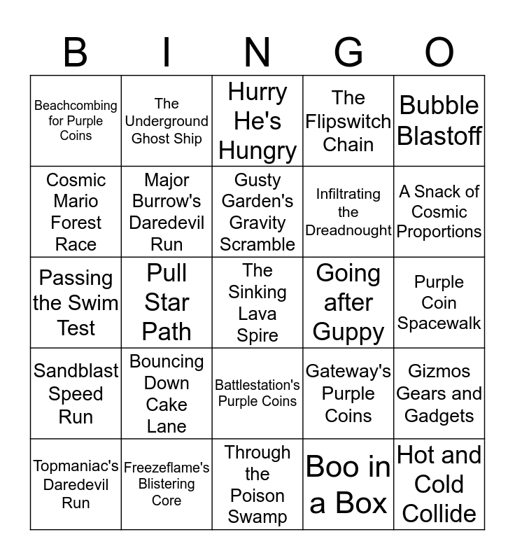 This bingo card has 25 words: Bouncing Down Cake Lane, Through the Poison Swamp, Gusty Garden's Gravity Scramble, Topmaniac's Daredevil Run, Bubble Blastoff, Beachcombing for Purple Coins, Cosmic Mario Forest Race, The Underground Ghost Ship, Going after Guppy, Battlestation's Purple Coins, Infiltrating the Dreadnought, Passing the Swim Test, Gateway's Purple Coins, Gizmos Gears and Gadgets, Major Burrow's Daredevil Run, Hot and Cold Collide, Purple Coin Spacewalk, Hurry He's Hungry, A Snack of Cosmic Proportions, Pull Star Path, The Sinking Lava Spire, Freezeflame's Blistering Core, Sandblast Speed Run, The Flipswitch Chain and Boo in a Box.