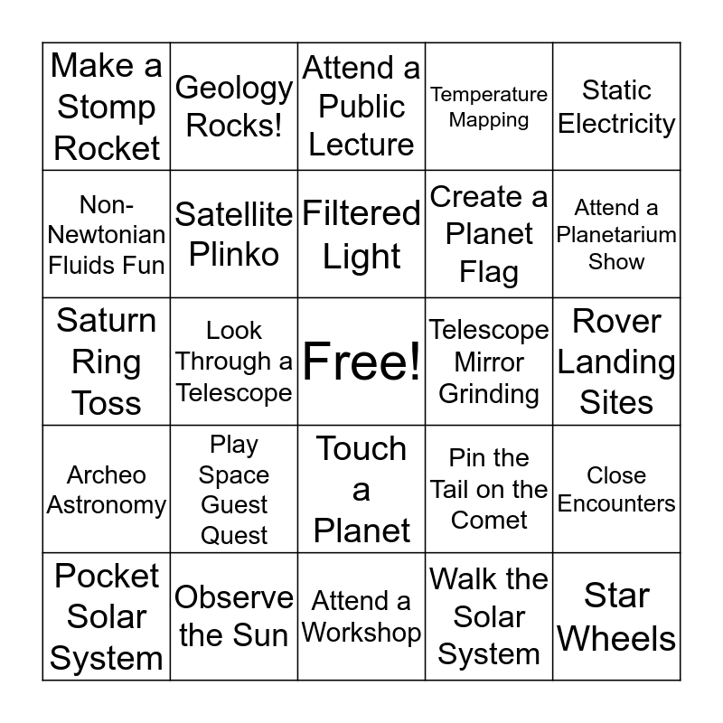 This bingo card has a free space and 24 words: Play Space Guest Quest, Observe the Sun, Filtered Light, Pocket Solar System, Static Electricity, Make a Stomp Rocket, Non-Newtonian Fluids Fun, Geology Rocks!, Telescope Mirror Grinding, Touch a Planet, Create a Planet Flag, Saturn Ring Toss, Pin the Tail on the Comet, Close Encounters, Satellite Plinko, Walk the Solar System, Rover Landing Sites, Attend a Public Lecture, Attend a Planetarium Show, Look Through a Telescope, Star Wheels, Archeo Astronomy, Temperature Mapping and Attend a Workshop.