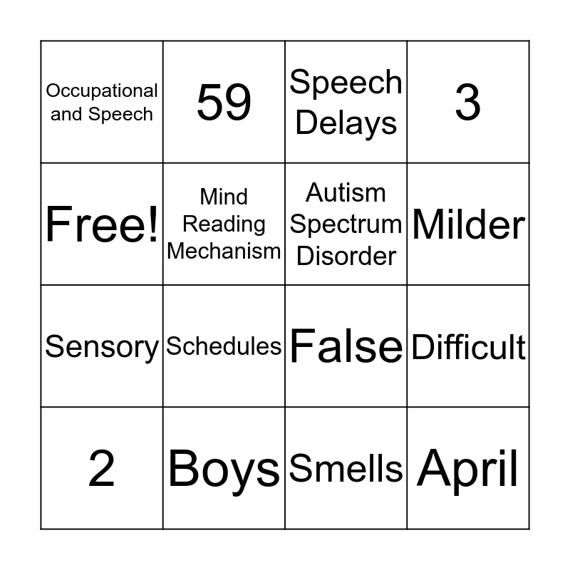 This bingo card has 16 words: Boys, Difficult, Speech Delays, Occupational and Speech, Sensory, 59, False, Smells, Free!, Mind Reading Mechanism, 2, 3, Schedules, Milder, Autism Spectrum Disorder and April.
