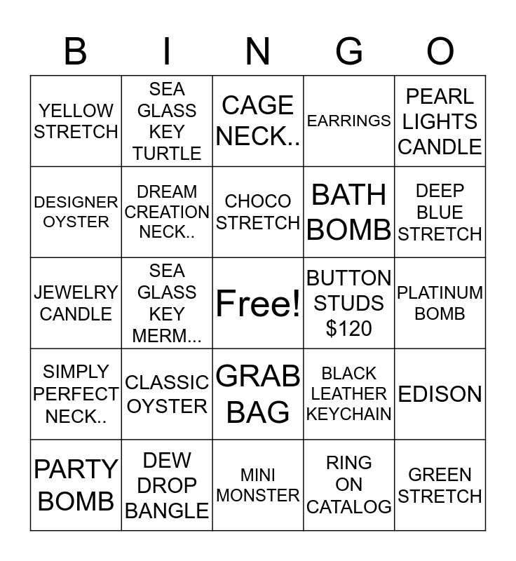 This bingo card has a free space and 24 words: CLASSIC OYSTER, DEW DROP BANGLE, CHOCO STRETCH, PARTY BOMB, PEARL LIGHTS CANDLE, YELLOW STRETCH, DESIGNER OYSTER, SEA GLASS KEY TURTLE, BUTTON STUDS $120, GRAB BAG, BATH BOMB, JEWELRY CANDLE, BLACK LEATHER KEYCHAIN, EDISON, DREAM CREATION NECK.., RING ON CATALOG, PLATINUM BOMB, CAGE NECK.., DEEP BLUE STRETCH, SEA GLASS KEY MERM..., GREEN STRETCH, SIMPLY PERFECT NECK.., EARRINGS and MINI MONSTER.