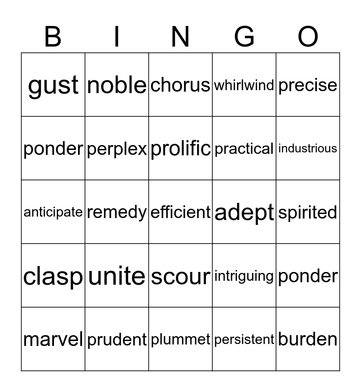 This bingo card has a free space and 30 words: prudent, admonish, remedy, craft, gust, chorus, perplex, scour, adept, plummet, spirited, burden, persistent, fluently, industrious, sound, intriguing, clasp, unite, precise, anticipate, content, noble, practical, ponder, whirlwind, ponder, marvel, prolific and resourceful.