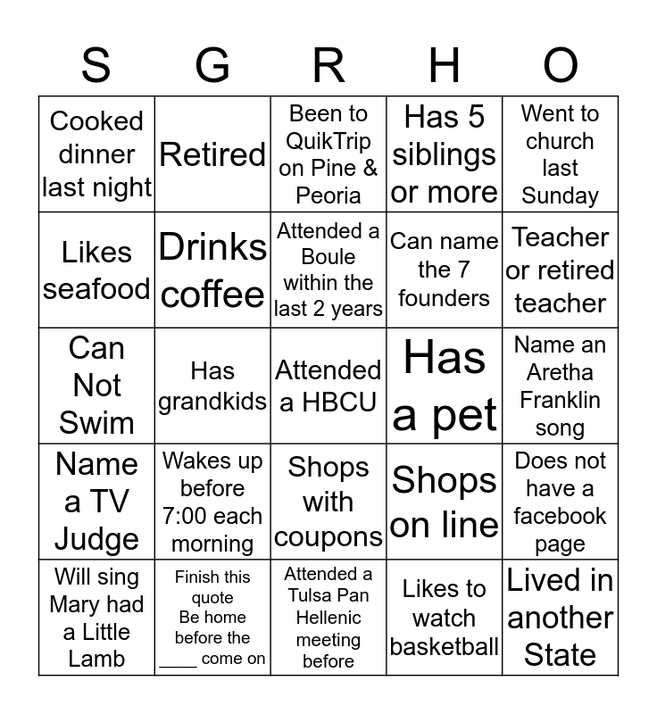 This bingo card has 25 words: Wakes up before 7:00 each morning, Attended a Tulsa Pan Hellenic meeting before, Attended a Boule within the last 2 years, Will sing Mary had a Little Lamb, Went to church last Sunday, Cooked dinner last night, Likes seafood, Retired, Has a pet, Shops with coupons, Can name the 7 founders, Can Not Swim, Shops on line, Does not have a facebook page, Drinks coffee, Lived in another State, Name an Aretha Franklin song, Been to QuikTrip on Pine & Peoria, Teacher or retired teacher, Has grandkids, Attended a HBCU, Finish this quote Be home before the ____ come on, Name a TV Judge, Has 5 siblings or more and Likes to watch basketball.