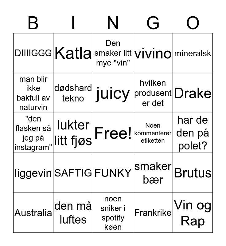 This bingo card has a free space and 24 words: SAFTIG, den må luftes, juicy, Australia, mineralsk, DIIIIGGG, man blir ikke bakfull av naturvin, Katla, Noen kommenterer etiketten, FUNKY, hvilken produsent er det, "den flasken så jeg på instagram", smaker bær, Brutus, dødshard tekno, Frankrike, har de den på polet?, Den smaker litt mye "vin", Drake, lukter litt fjøs, Vin og Rap, liggevin, vivino and noen sniker i spotify køen.