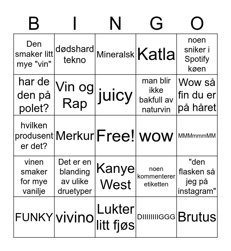 This bingo card has a free space and 24 words: Det er en blanding av ulike druetyper, vivino, juicy, FUNKY, noen sniker i Spotify køen, Den smaker litt mye "vin", har de den på polet?, dødshard tekno, wow, Kanye West, man blir ikke bakfull av naturvin, hvilken produsent er det?, noen kommenterer etiketten, "den flasken så jeg på instagram", Vin og Rap, DIIIIIIIIGGG, MMMmmmMM, Mineralsk, Wow så fin du er på håret, Merkur, Brutus, vinen smaker for mye vanilje, Katla and Lukter litt fjøs.