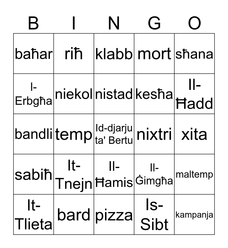 This bingo card has a free space and 24 words: It-Tnejn, bard, nistad, It-Tlieta, sħana, baħar, l-Erbgħa, riħ, nixtri, Il-Ħamis, kesħa, bandli, Il-Ġimgħa, maltemp, niekol, Is-Sibt, xita, klabb, Il-Ħadd, temp, kampanja, sabiħ, mort and pizza.