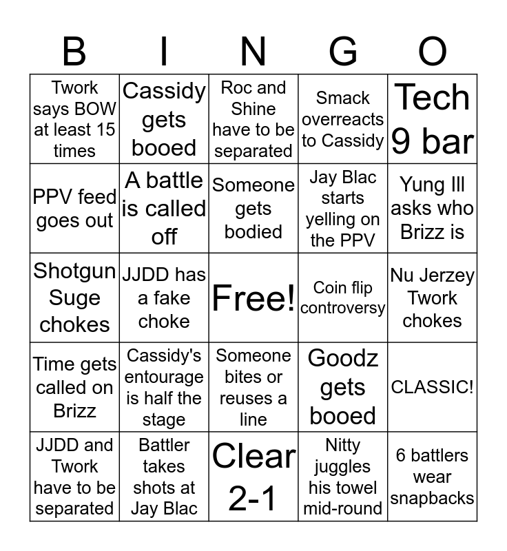 This bingo card has a free space and 24 words: Cassidy's entourage is half the stage, Battler takes shots at Jay Blac, Someone gets bodied, JJDD and Twork have to be separated, Tech 9 bar, Twork says BOW at least 15 times, PPV feed goes out, Cassidy gets booed, Coin flip controversy, Someone bites or reuses a line, Jay Blac starts yelling on the PPV, Shotgun Suge chokes, Goodz gets booed, CLASSIC!, A battle is called off, Nitty juggles his towel mid-round, Nu Jerzey Twork chokes, Roc and Shine have to be separated, Yung Ill asks who Brizz is, JJDD has a fake choke, 6 battlers wear snapbacks, Time gets called on Brizz, Smack overreacts to Cassidy and Clear 2-1.