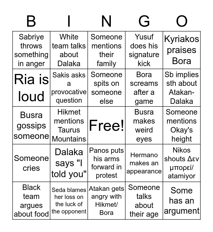 This bingo card has a free space and 24 words: Dalaka says "I told you", Seda blames her loss on the luck of the opponent, Someone spits on someone else, Black team argues about food, Kyriakos praises Bora, Sabriye throws something in anger, Ria is loud, White team talks about Dalaka, Busra makes weird eyes, Panos puts his arms forward in protest, Bora screams after a game, Busra gossips someone, Hermano makes an appearance, Nikos shouts Δεν μπορεί/ atamiyor, Sakis asks a provocative question, Someone talks about their age, Someone mentions Okay's height, Someone mentions their family, Sb implies sth about Atakan-Dalaka, Hikmet mentions Taurus Mountains, Some has an argument, Someone cries, Yusuf does his signature kick and Atakan gets angry with Hikmet/ Bora.