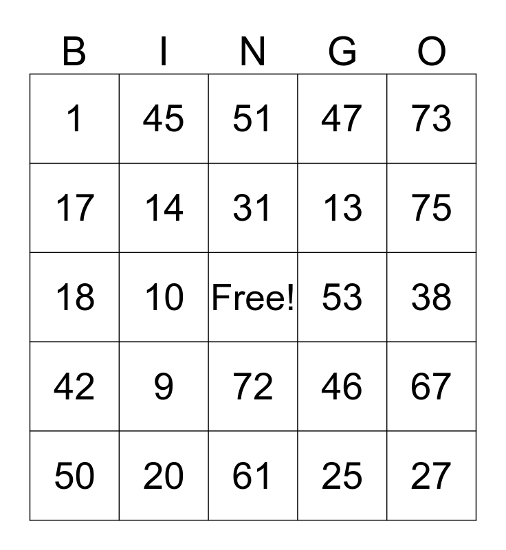 This bingo card has a free space and 24 words: 9, 20, 31, 50, 73, 1, 17, 45, 53, 72, 13, 18, 46, 67, 14, 25, 38, 51, 75, 10, 27, 42, 47 and 61.