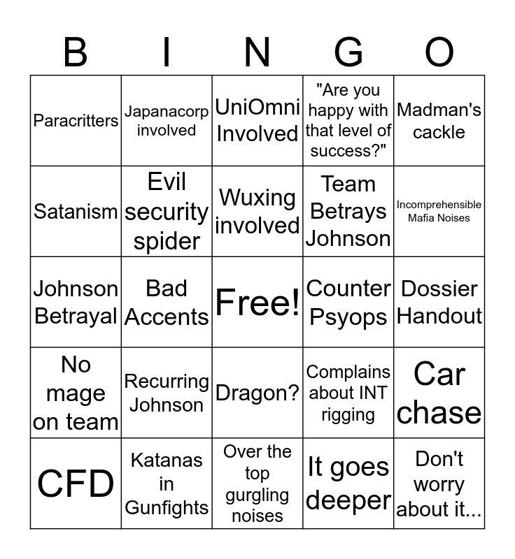 This bingo card has a free space and 32 words: It goes deeper, Briefcases, Bad Accents, Extended hacking sequence, No mage on team, Evil security spider, Madman's cackle, Car chase, Japanacorp involved, Wired security/ data, Wuxing involved, UniOmni Involved, Burn edge, Triad/ Yakuza Hitsquad, Counter Psyops, Overseas run, CFD, Johnson Betrayal, Dragon?, Recurring Johnson, Complains about INT rigging, Accent that turns into Russian, Dossier Handout, Katanas in Gunfights, Don't worry about it..., "Are you happy with that level of success?", Team Betrays Johnson, Satanism, Paracritters, Over the top gurgling noises, Says Yeet and Incomprehensible Mafia Noises.