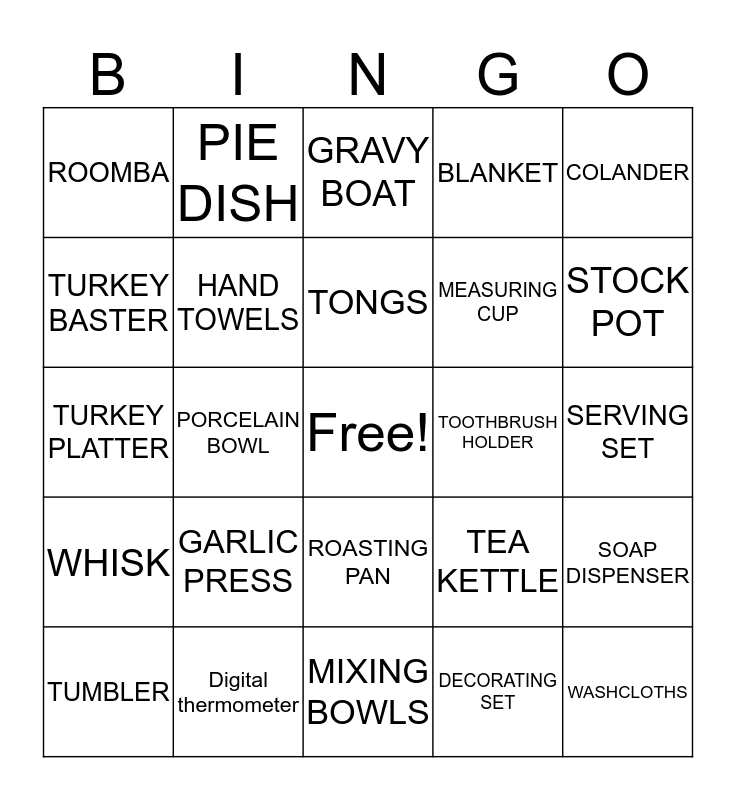 This bingo card has a free space and 58 words: Cordless vacuum, Digital thermometer, STEAMER, WHISK, DECORATING SET, SUGAR AND CREAMER, HAND TOWELS, CORNINGWARE, MEASURING CUP, MIXING BOWL, BLANKET, BATH TOWELS, DECORATING PEN, CHEESE KNIVES, CAST IRON SKILLET, ROOMBA, WASHCLOTHS, COLANDER, POTS AND PANS, TONGS, TOOTHBRUSH HOLDER, GRAVY BOAT, TUMBLER, SOAP DISPENSER, WASTEBASKET, SERVING SET, COFFEE GRINDER, MILK FROTHER, STOCK POT, FRYING PAN, LAUNDRY BASKET, TEA POT, SHOT GLASSES, COFFEE MAKER, BUTTER DISH, 16 PIECE DINNERWARE SET, BAR SET, PORCELAIN BOWL, TURKEY PLATTER, RECTANGULAR PLATTER, GARLIC PRESS, KATE SPADE BOWL, TEA KETTLE, UTENSIL CROCK SET, HAND MIXER, CAKE TESTER, RECTANGULAR CASSEROLE DISH, ROASTING PAN, MIXING BOWLS, CHEESE BOARD, VITAMIX, SQUARE CASSEROLE DISH, HAND SKILLET, DOUBLE OLD FASHIONED GLASSES, PIE DISH, HIGHBALL GLASSES, TURKEY BASTER and STRAINER.