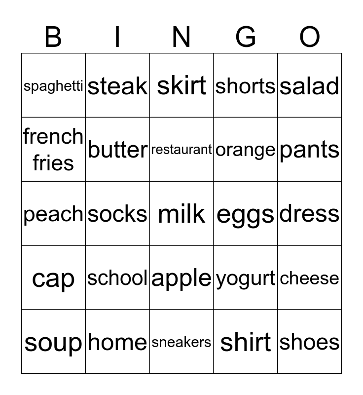 This bingo card has a free space and 24 words: school, home, restaurant, soup, salad, spaghetti, french fries, steak, eggs, apple, orange, peach, yogurt, cheese, butter, shirt, dress, skirt, pants, socks, shoes, cap, shorts and sneakers.