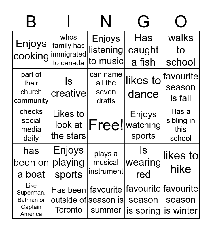 This bingo card has a free space and 29 words: Like Superman, Batman or Captain America, Can whistle a song, Likes to look at the stars, Enjoys reading books, Enjoys cooking, Enjoys listening to music, Is creative, Enjoys playing sports, Enjoys watching sports, Has been outside of Toronto, Has a sibling in this school, favourite season is winter, favourite season is summer, favourite season is spring, favourite season is fall, has been on a plane, plays a musical instrument, has been on a boat, walks to school, checks social media daily, Is wearing red, Has followed directions and has made/built something, likes to dance, part of their church community, Has caught a fish, whos family has immigrated to canada, likes to hike, can name all the seven drafts and can name all the planets in the solar system.
