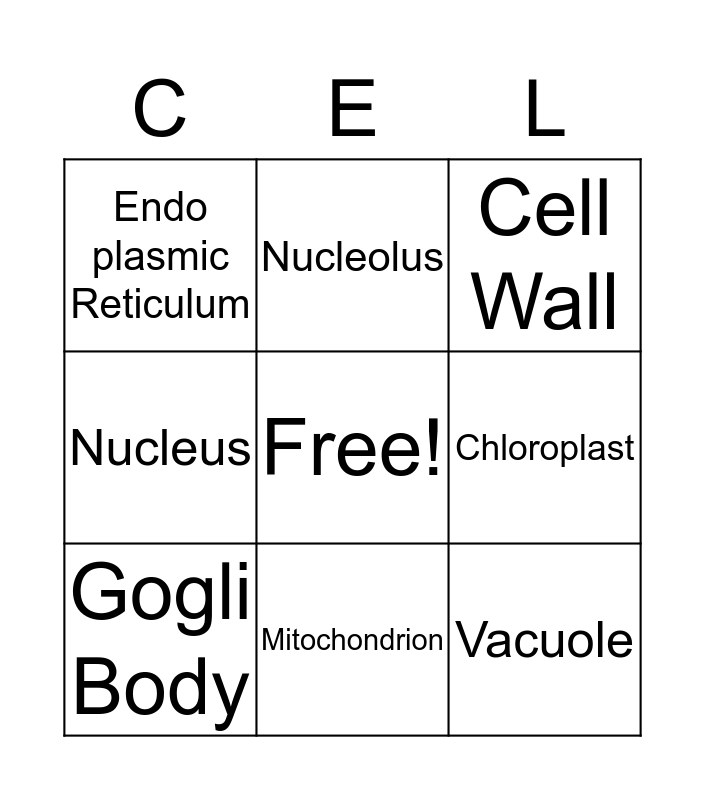 This bingo card has a free space and 8 words: Chloroplast, Cell Wall, Nucleolus, Gogli Body, Endo plasmic Reticulum, Vacuole, Nucleus and Mitochondrion.
