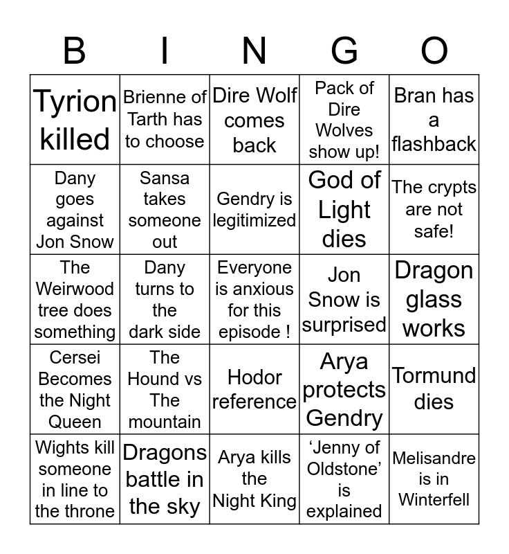 This bingo card has a free space and 24 words: The Hound vs The mountain, Dragons battle in the sky, Gendry is legitimized, Wights kill someone in line to the throne, Bran has a flashback, Tyrion killed, Dany goes against Jon Snow, Brienne of Tarth has to choose, Jon Snow is surprised, Hodor reference, God of Light dies, The Weirwood tree does something, Arya protects Gendry, Tormund dies, Sansa takes someone out, ‘Jenny of Oldstone’ is explained, Dragon glass works, Dire Wolf comes back, The crypts are not safe!, Dany turns to the dark side, Melisandre is in Winterfell, Cersei Becomes the Night Queen, Pack of Dire Wolves show up! and Arya kills the Night King.