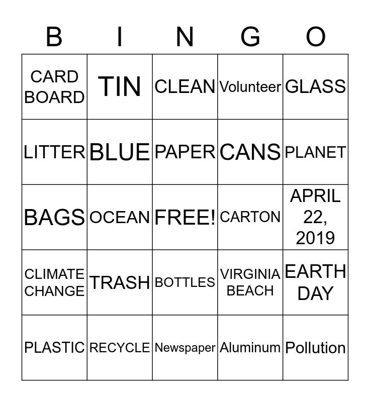 This bingo card has a free space and 24 words: TRASH, RECYCLE, PAPER, PLASTIC, GLASS, CARD BOARD, LITTER, TIN, CARTON, BOTTLES, CANS, BAGS, VIRGINIA BEACH, EARTH DAY, BLUE, Aluminum, APRIL 22, 2019, CLEAN, PLANET, OCEAN, Pollution, CLIMATE CHANGE, Volunteer and Newspaper.