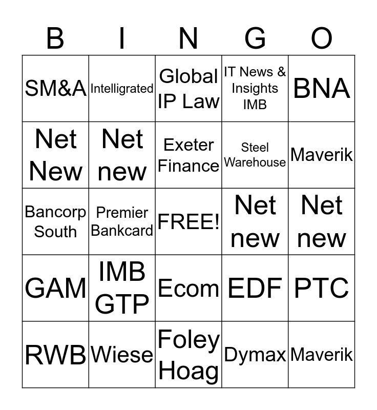 This bingo card has a free space and 24 words: IMB GTP, Wiese, Exeter Finance, RWB, BNA, SM&A, Net New, Intelligrated, Net new, Ecom, Steel Warehouse, Bancorp South, EDF, PTC, Net new, Dymax, Net new, Global IP Law, Maverik, Premier Bankcard, Maverik, GAM, IT News & Insights IMB and Foley Hoag.