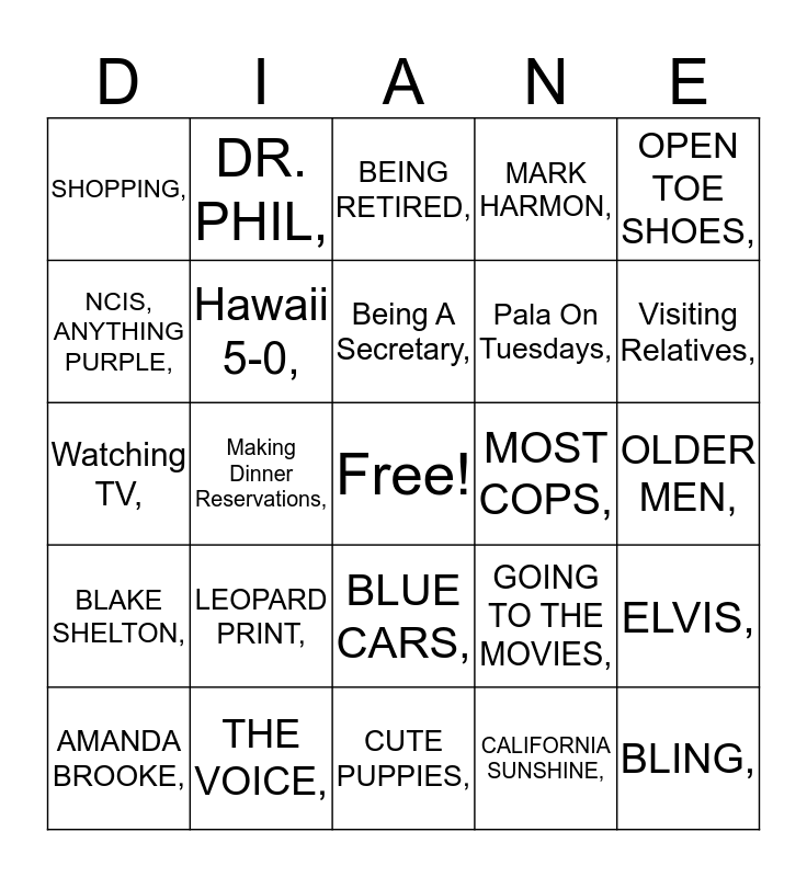 This bingo card has a free space and 28 words: ELVIS,, ICE CREAM,, Pala On Tuesdays,, CALIFORNIA SUNSHINE,, NCIS, ANYTHING PURPLE,, BEING RETIRED,, DR. PHIL,, BLAKE SHELTON,, MOST COPS,, AMANDA BROOKE,, Watching TV,, MARK HARMON,, THE VOICE,, CUTE PUPPIES,, Visiting Relatives,, SAVING MONEY,, LEOPARD PRINT,, Hawaii 5-0,, Being A Secretary,, BLUE CARS,, SHOPPING,, PEDAL PUSHERS,, BLING,, Making Dinner Reservations,, OLDER MEN,, GOING TO THE MOVIES,, OPEN TOE SHOES, and JEWELRY,.