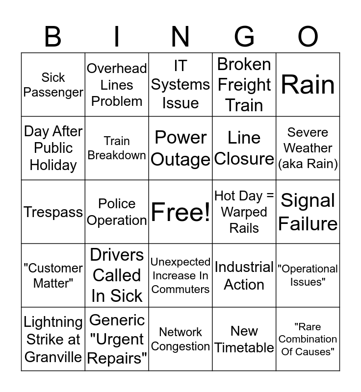 This bingo card has a free space and 24 words: Lightning Strike at Granville, Drivers Called In Sick, Power Outage, New Timetable, Rain, Sick Passenger, Overhead Lines Problem, IT Systems Issue, Hot Day = Warped Rails, Signal Failure, Trespass, Train Breakdown, Industrial Action, "Operational Issues", Day After Public Holiday, Generic "Urgent Repairs", Network Congestion, Broken Freight Train, Severe Weather (aka Rain), "Customer Matter", Police Operation, Unexpected Increase In Commuters, Line Closure and "Rare Combination Of Causes".