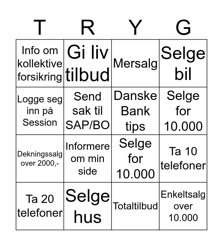 This bingo card has 16 words: Selge hus, Ta 10 telefoner, Mersalg, Info om kollektive forsikring, Dekningssalg over 2000,-, Gi liv tilbud, Selge for 10.000, Totaltilbud, Logge seg inn på Session, Send sak til SAP/BO, Ta 20 telefoner, Selge bil, Informere om min side, Selge for 10.000, Danske Bank tips and Enkeltsalg over 10.000.