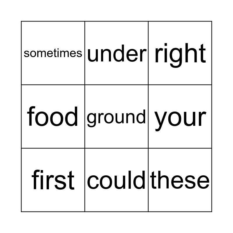 This bingo card has 9 words: first, right, under, food, sometimes, your, ground, these and could.