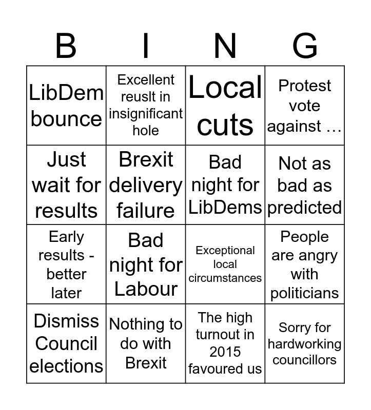 This bingo card has 23 words: Sorry for hardworking councillors, 2015 was exceptional, Not as bad as predicted, Mid terms, Just wait for results, LibDem bounce, Brexit delivery failure, Excellent reuslt in insignificant hole, Dismiss Council elections, Thanet and UKIP, Bad night for Labour, Early results - better later, Our good places are counting until tomorrow, Not a good area for us (Lost Control), Nothing to do with Brexit, Local Issues campaign, Local cuts, Exceptional local circumstances, Bad night for LibDems, People are angry with politicians, Protest vote against …, The high turnout in 2015 favoured us and The low turnout has helped X.