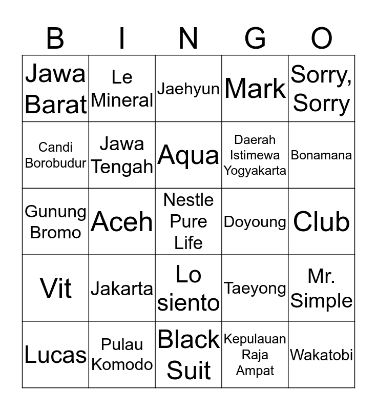 This bingo card has a free space and 24 words: Jakarta, Pulau Komodo, Aqua, Lucas, Sorry, Sorry, Jawa Barat, Candi Borobudur, Le Mineral, Doyoung, Lo siento, Daerah Istimewa Yogyakarta, Gunung Bromo, Taeyong, Mr. Simple, Jawa Tengah, Kepulauan Raja Ampat, Club, Jaehyun, Bonamana, Aceh, Wakatobi, Vit, Mark and Black Suit.