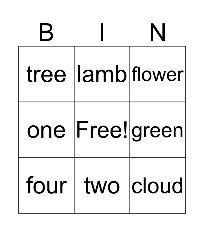 This bingo card has a free space and 20 words: bird, egg, flower, bunny, kite, cloud, bud, tree, spring, lamb, rain, nest, green, seed, four, three, two, one, chick and five.