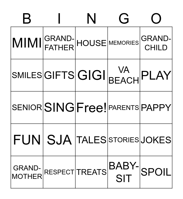 This bingo card has a free space and 34 words: LOVE, BABY-SIT, ELDER, FAMILY, FUN, GIFTS, GRAND-CHILD, GRAND-MOTHER, GRAND-FATHER, PAPA, GIGI, HOUSE, HUG, NANA, PARENTS, PLAY, RESPECT, SENIOR, SJA, STORIES, TALES, COOKIES, MIMI, PAPPY, TREATS, SPOIL, MEMORIES, GAMES, VA BEACH, SMILES, HAPPY, SING, JOKES and BED TIME.