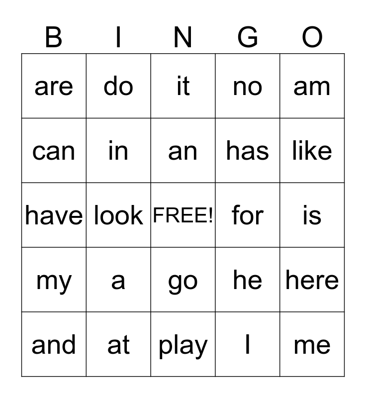 This bingo card has a free space and 24 words: a, at, an, and, am, are, can, do, for, go, has, have, he, here, in, I, is, it, like, look, me, my, no and play.