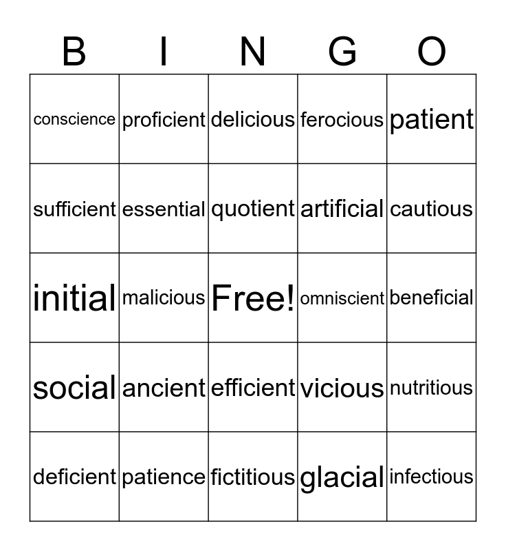 This bingo card has a free space and 24 words: ancient, patience, quotient, deficient, patient, conscience, sufficient, proficient, omniscient, efficient, artificial, initial, vicious, nutritious, essential, glacial, beneficial, delicious, cautious, malicious, infectious, social, ferocious and fictitious.