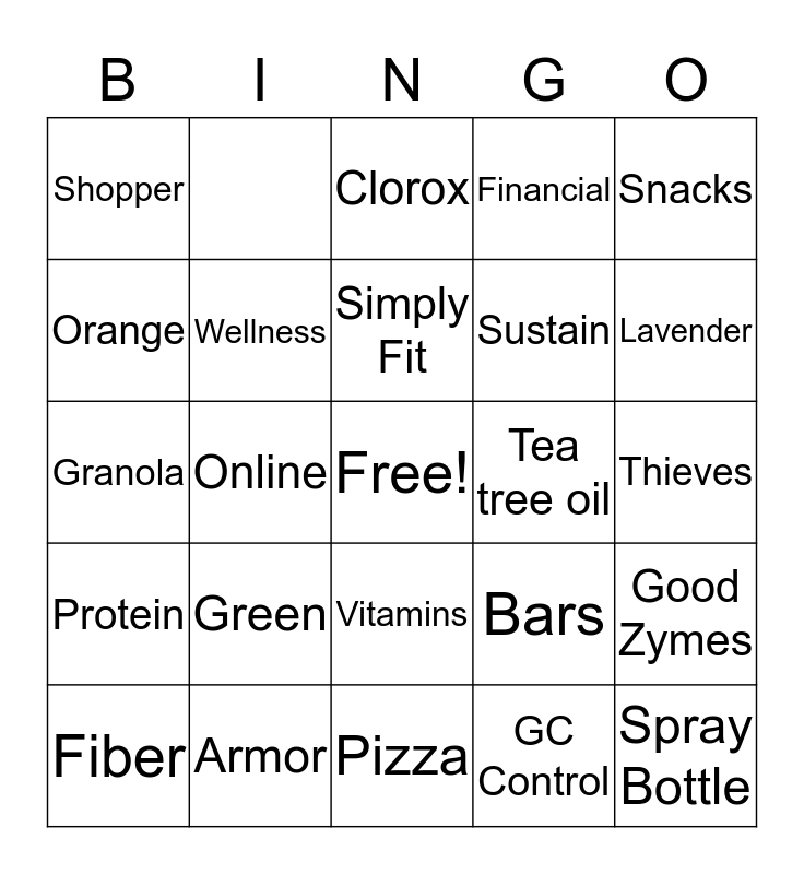 This bingo card has a free space and 28 words: Fiber, NonToxic, Online, Melaleuca, Shopper, Clorox, Wellness, Green, Tea tree oil, Armor, Thieves, Spray Bottle, Pizza, GC Control, Lavender, Probiotic, Vitamins, Protein, Snacks, Granola, Bars, Attain, Sustain, Orange, Financial, Good Zymes, Simply Fit and 6 isles.