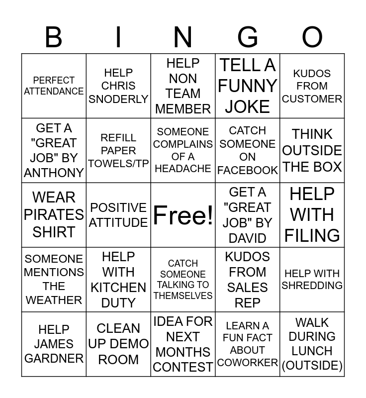 This bingo card has a free space and 29 words: HELP JAMES GARDNER, HELPS A TEAMMATE, POSITIVE ATTITUDE, HELP A NEW HIRE, PERFECT ATTENDANCE, HELP NON TEAM MEMBER, REFILL PAPER TOWELS/TP, HELP WITH KITCHEN DUTY, GET A "GREAT JOB" BY DAVID, CLEAN UP DEMO ROOM, HELP WITH FILING, WALK DURING LUNCH (OUTSIDE), IDEA FOR NEXT MONTHS CONTEST, LEARN A FUN FACT ABOUT COWORKER, THINK OUTSIDE THE BOX, FIX A COPIER JAM, CATCH SOMEONE TALKING TO THEMSELVES, SOMEONE MENTIONS THE WEATHER, KUDOS FROM CUSTOMER, WEAR PIRATES SHIRT, KUDOS FROM SALES REP, SHARE AN EXCEL TIP, CATCH SOMEONE ON FACEBOOK, GET A "GREAT JOB" BY ANTHONY, TELL A FUNNY JOKE, HELP CHRIS SNODERLY, HELP WITH SHREDDING, SOMEONE COMPLAINS OF A HEADACHE and GET A "GREAT JOB" BY SALES MGR.