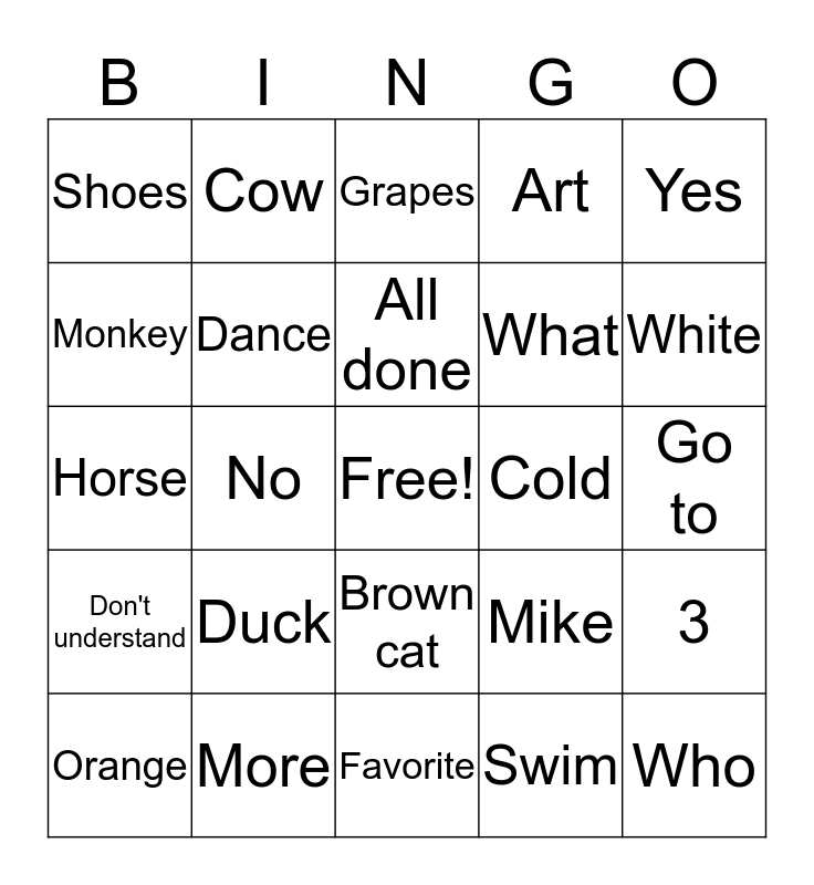 This bingo card has a free space and 24 words: Duck, More, All done, Orange, Yes, Shoes, Monkey, Cow, Cold, Brown cat, What, Horse, Mike, 3, Dance, Swim, Go to, Grapes, White, No, Who, Don't understand, Art and Favorite.