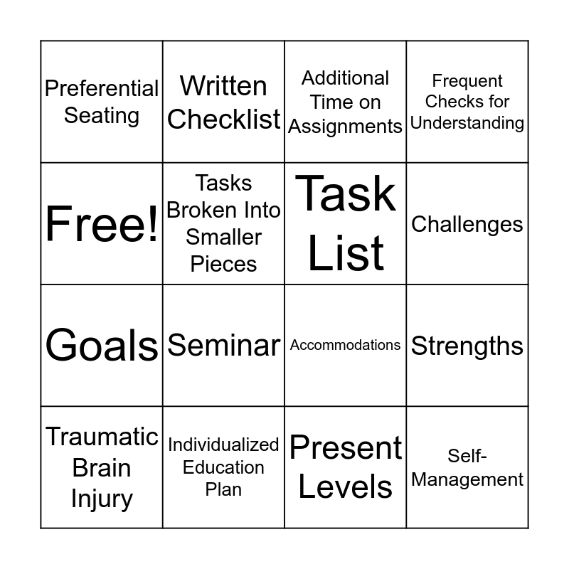 This bingo card has 16 words: Individualized Education Plan, Strengths, Additional Time on Assignments, Preferential Seating, Goals, Written Checklist, Accommodations, Present Levels, Free!, Tasks Broken Into Smaller Pieces, Traumatic Brain Injury, Frequent Checks for Understanding, Seminar, Challenges, Task List and Self-Management.