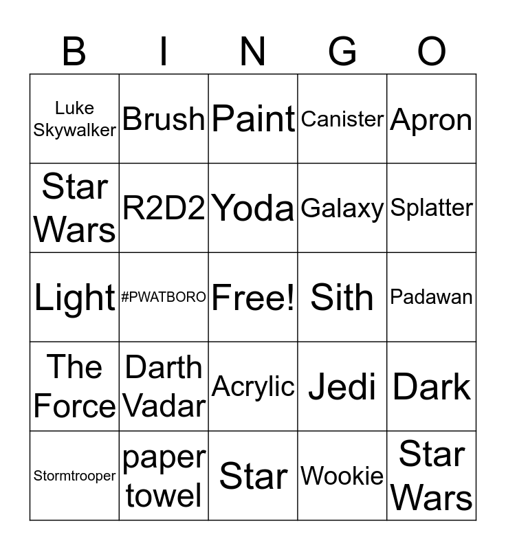 This bingo card has a free space and 27 words: Jedi, Light Saber, Galaxy, Star, Star Wars, Paint, Brush, The Force, Sith, Dark, Light, Canister, Stormtrooper, paper towel, Splatter, Cloak, R2D2, Yoda, Darth Vadar, Luke Skywalker, Padawan, Wookie, #PWATBORO, Star Wars, Acrylic, Apron and Knight.