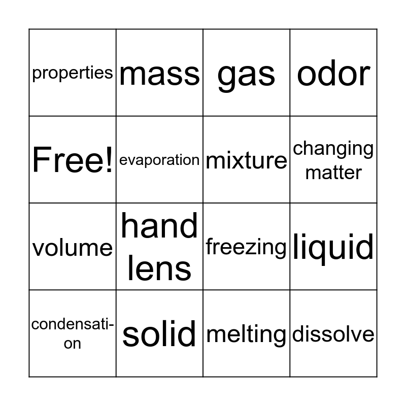This bingo card has 16 words: solid, liquid, gas, properties, volume, mass, freezing, melting, Free!, evaporation, condensati-on, odor, hand lens, changing matter, mixture and dissolve.