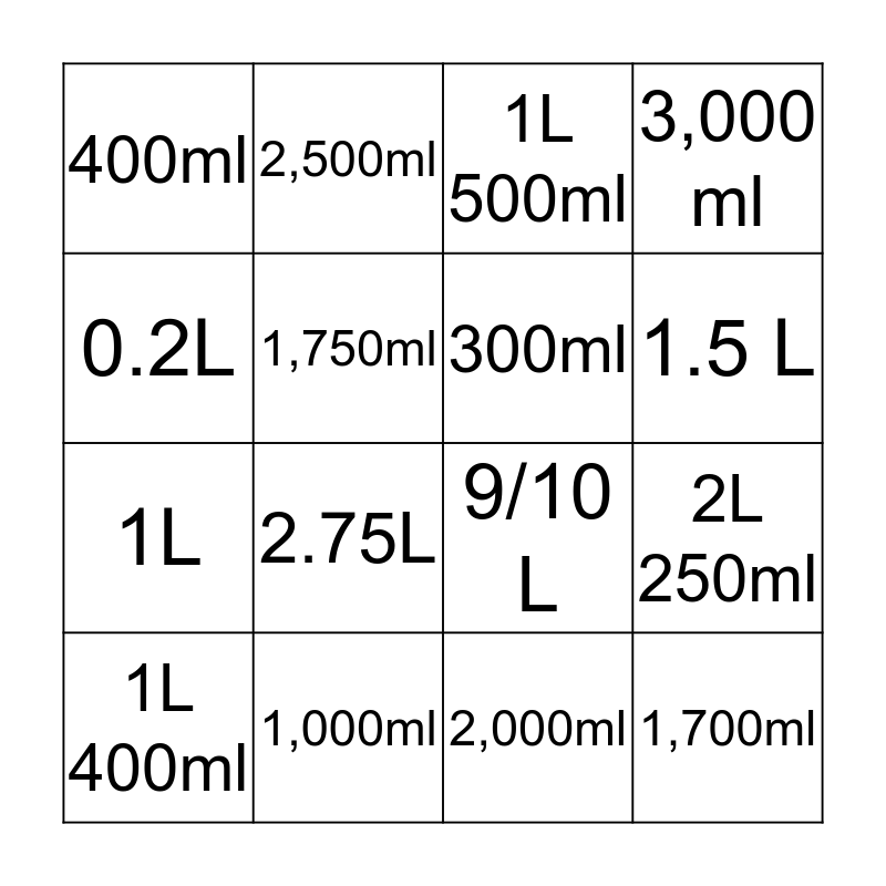 This bingo card has 24 words: 2L, 500ml, 1.5 L, 1/10 L, 0.2L, 400ml, 1,750ml, 2,500ml, 1,000ml, 750ml, 1L, 9/10 L, 1/4 L, 1.25L, 300ml, 800ml, 2,000ml, 1L 500ml, 2.75L, 2L 250ml, 1L 400ml, 1,700ml, 3,000 ml and 1/2 L.