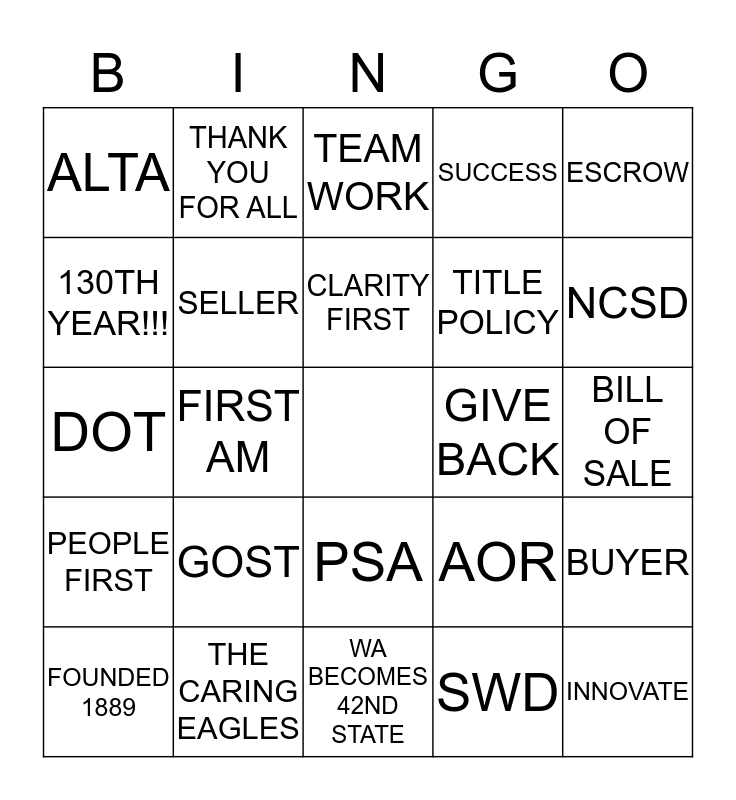 This bingo card has a free space and 24 words: GOST, THE CARING EAGLES, CLARITY FIRST, FOUNDED 1889, ESCROW, ALTA, 130TH YEAR!!!, THANK YOU FOR ALL, GIVE BACK, PSA, TITLE POLICY, DOT, AOR, BUYER, SELLER, SWD, BILL OF SALE, TEAM WORK, NCSD, FIRST AM, INNOVATE, PEOPLE FIRST, SUCCESS and WA BECOMES 42ND STATE.